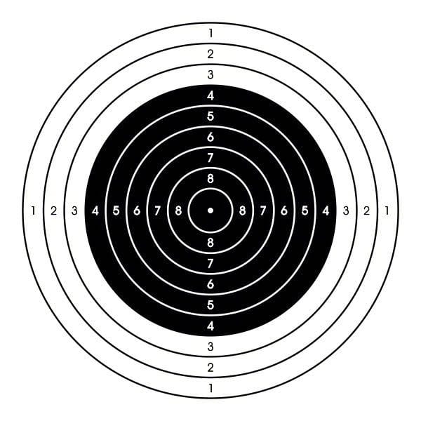 Die Scheibe ist in 10 Ringe unterteilt. die kleinste Trefferfläche ist dabei die 10. Diese Fläche ist nur 0,5mm groß.